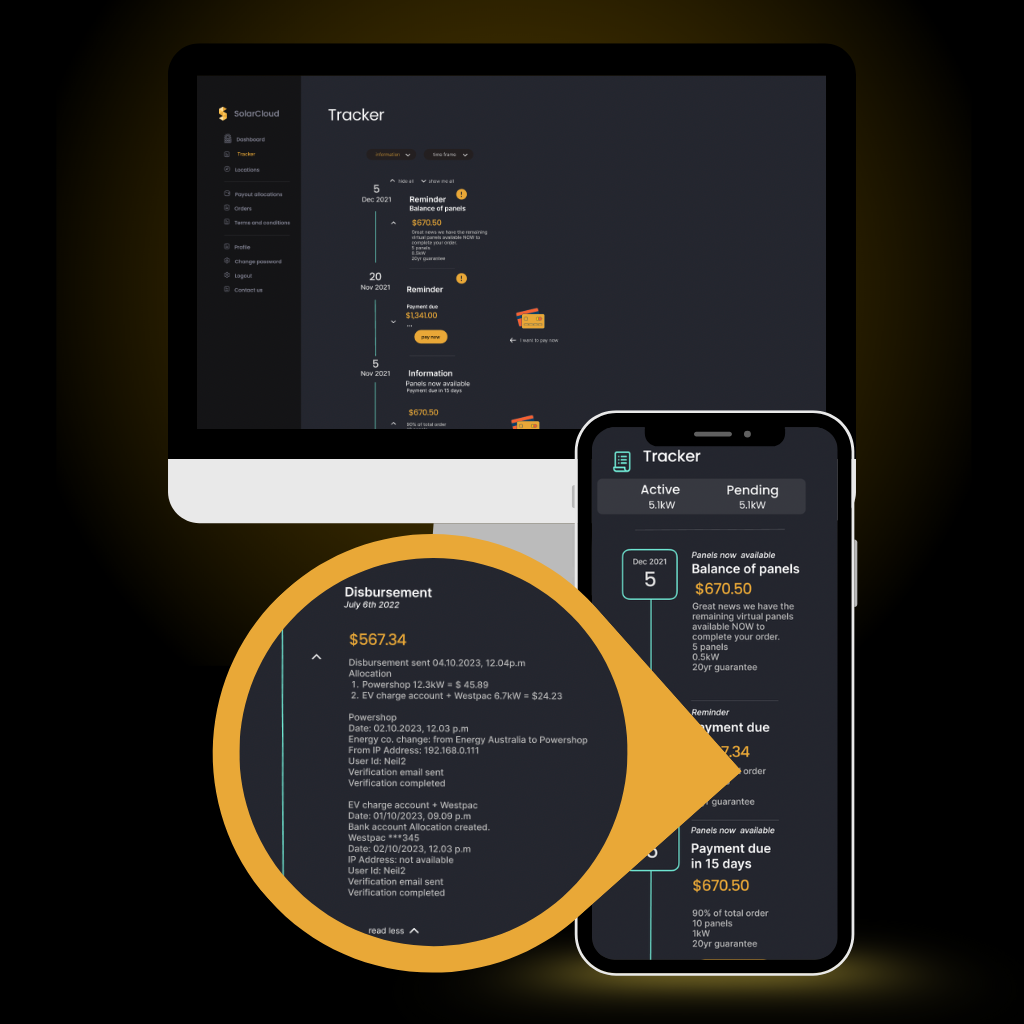 You can view everything from your purchase to your last disbursement. The tracker also shows where the funds were deposited and when. If you have bought panels and they are not yet active you can also keep track of their progress, a little bit like being notified of your order and delivery from Amazon etc…..